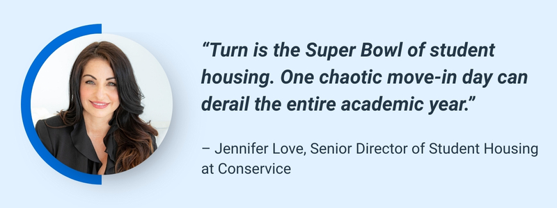 Student housing is intense because every unit turns over at once. Hundreds of beds need to be ready for the same day. Jennifer Love, Senior Director of Student Housing at Conservice, described it best in her Ask an Expert: