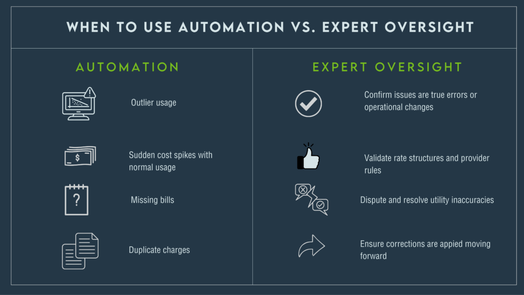 Automation can flag anomalies, but utility invoices often include details that still require context and verification. The strongest results come from using both.